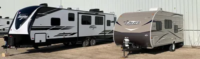 We only rent travel trailers, also known as "tow behind" trailers. These require a vehicle with a towing capacity between 5,000 lbs and 10,000 lbs, such as a truck, SUV, or minivan.
